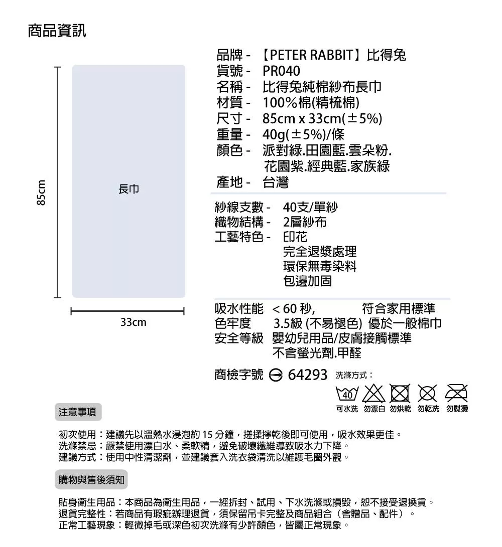名稱 - 比得兔純棉紗布長巾