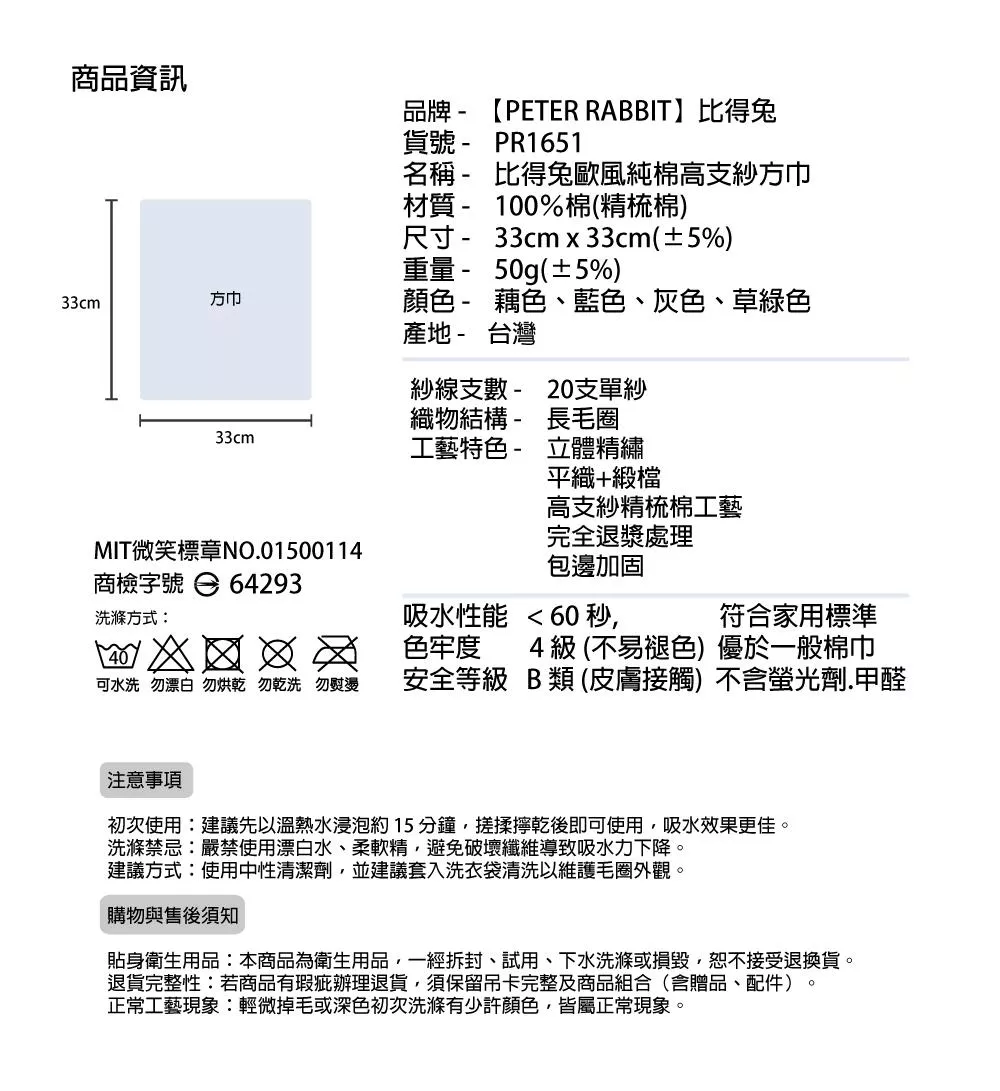 名稱 - 比得兔歐風純棉高支紗方巾