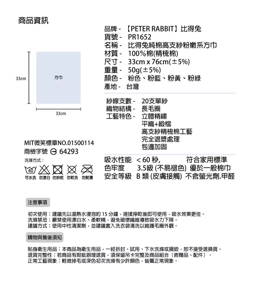 名稱 - 比得兔純棉高支紗粉嫩系方巾