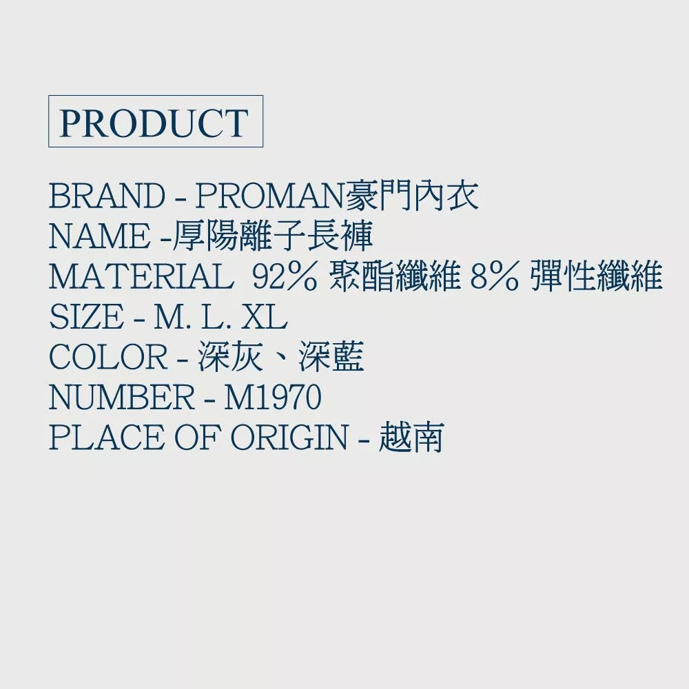 【PROMAN豪門】細絨陽離子速熱保暖男衛生長褲M1970保證原廠/國際大廠/