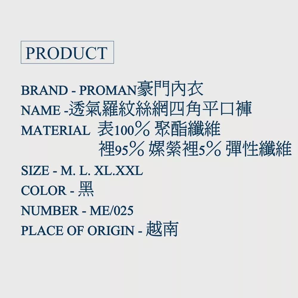 品號-【PROMAN 豪門】透氣羅紋絲網四角平口褲ME/025