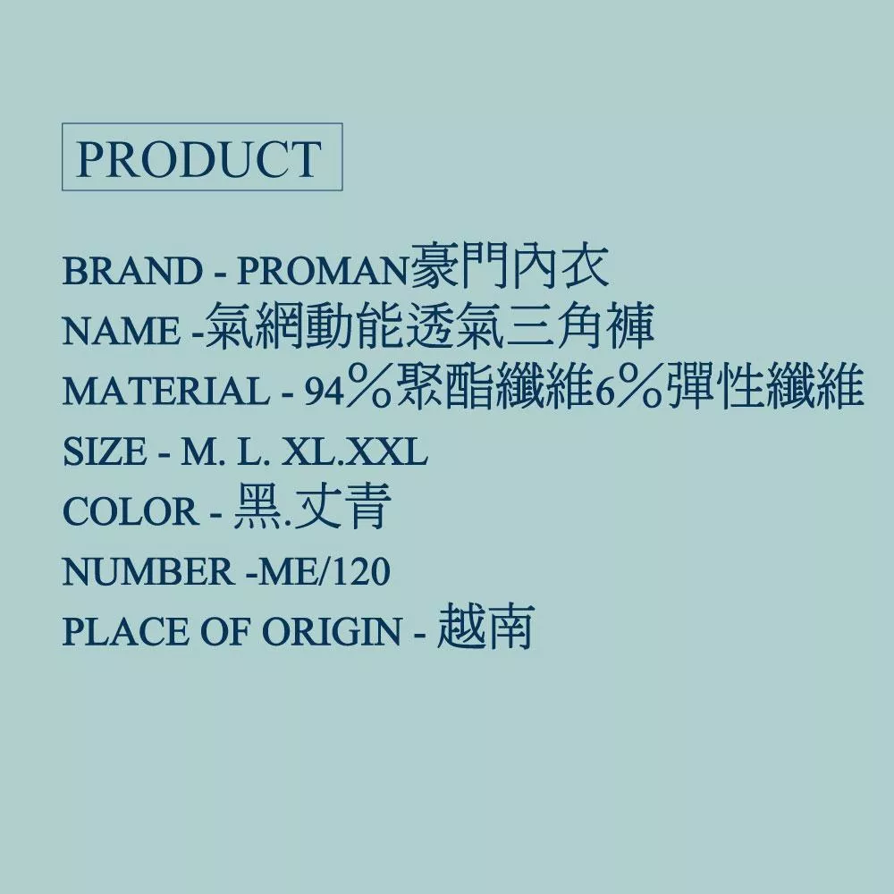 【PROMAN 豪門】氣網速乾彈性透氣男三角ME120(男內褲/保證原廠/男透氣內褲)