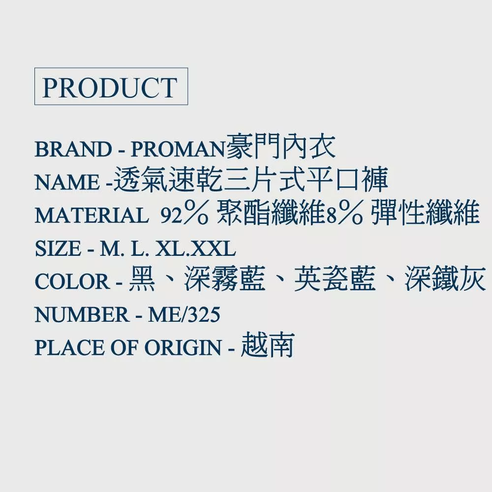 品號-【PROMAN 豪門】透氣速乾三片式平口褲ME/325